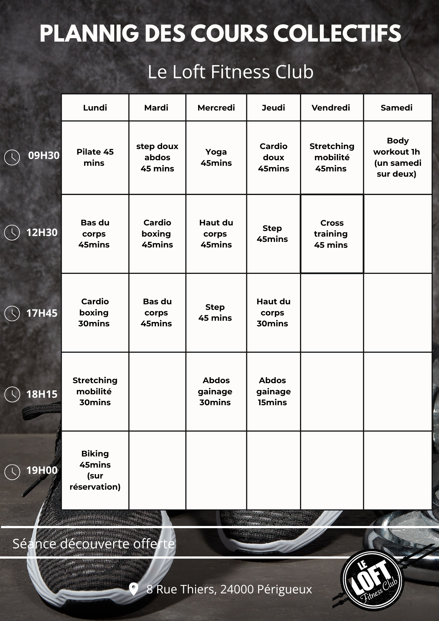 Au Loft, les cours collectifs ainsi que notre proximité avec nos adhérents, est ce qui fait de nous la meilleure valeur à PERIGUEUX. Nous avons fièrement poursuivi cette philosophie depuis la création de la salle. Nous proposons des cours FREESTYLE qui n’existe nulle par ailleurs car se sont nos coachs, personnellement, qui choisissent les musiques et qui imaginent les chorégraphies enchaînant ainsi des mouvements de renforcement, de cardio et de pilates. Les cours ne sont jamais les mêmes et nous sommes arrivés à une méthode efficace et stimulante pour notre clientèle. Peu importe votre niveau ou vos connaissances, nous vous amènerons toujours a votre but, suivrons votre évolution tout en vous protégeant physiquement.